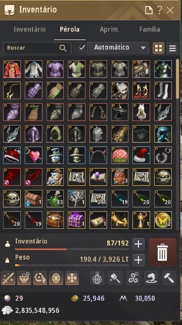 • Feiticeira – Trajes de lifeskill (~1800 maestria) + combate, 106 slots, 1261 LT.