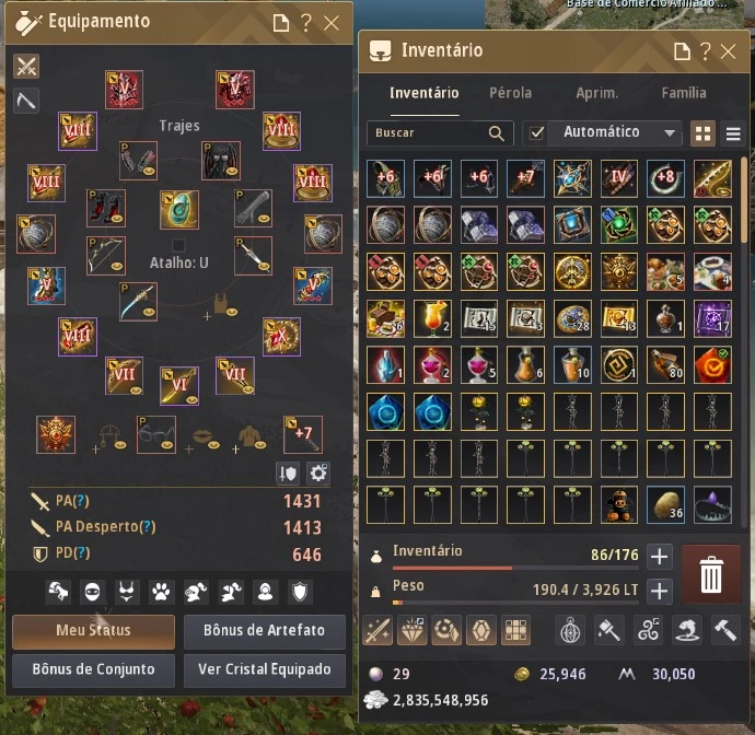 Conta completa, muito bem estruturada e pronta para jogar em alto nível, seja PvP, PvE ou Life Skill, com comodidades P2W, pets T5, barraca, presets, cristais e personagens bem preparados.
