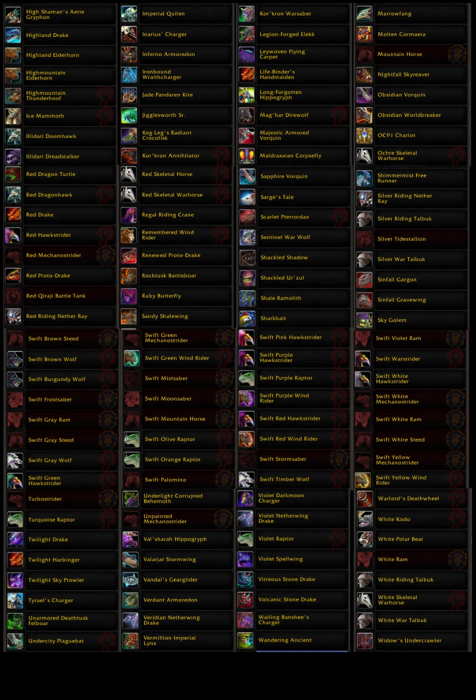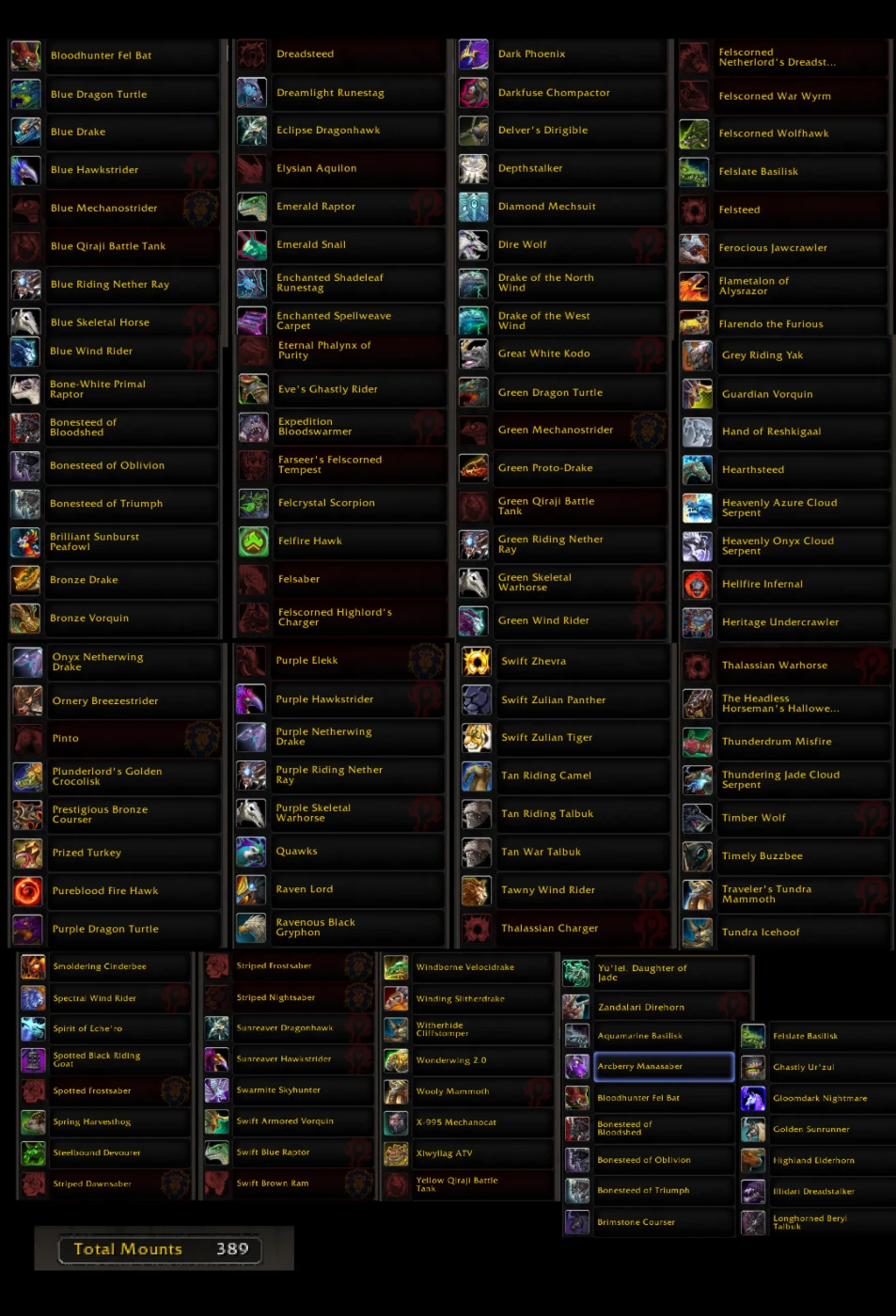 +380 Mounts (with rare extras and additional ones from Legion Remix).