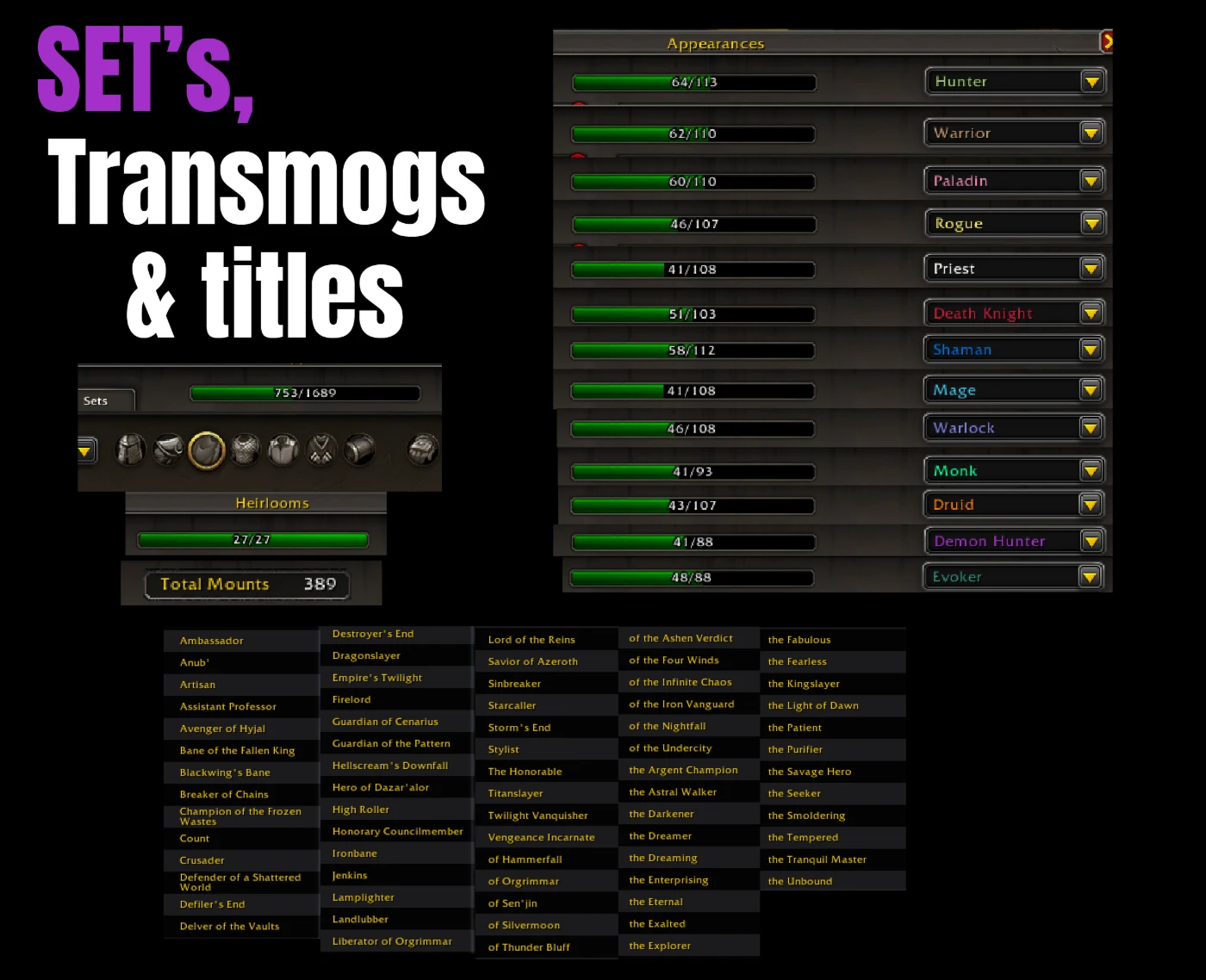Customization: Extensive collection of farmed transmog sets (mainly Mail, Plate, Weapons, and Cloaks).