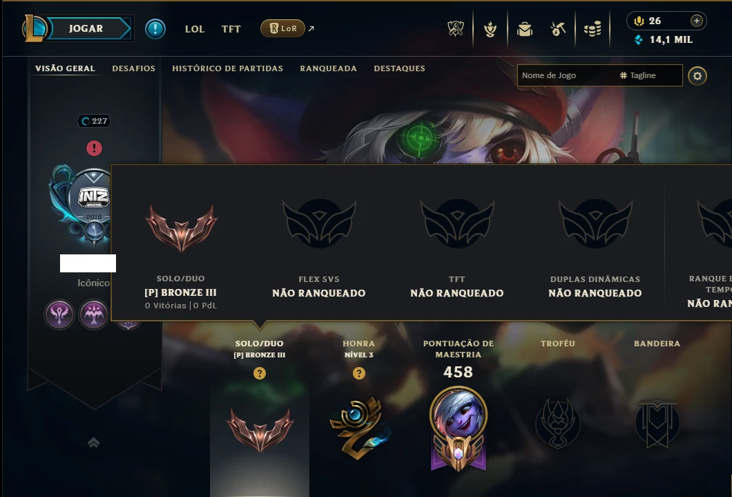 Bronze 3 com 155 Champs e 150 Skins ( ADC / MID / JG )