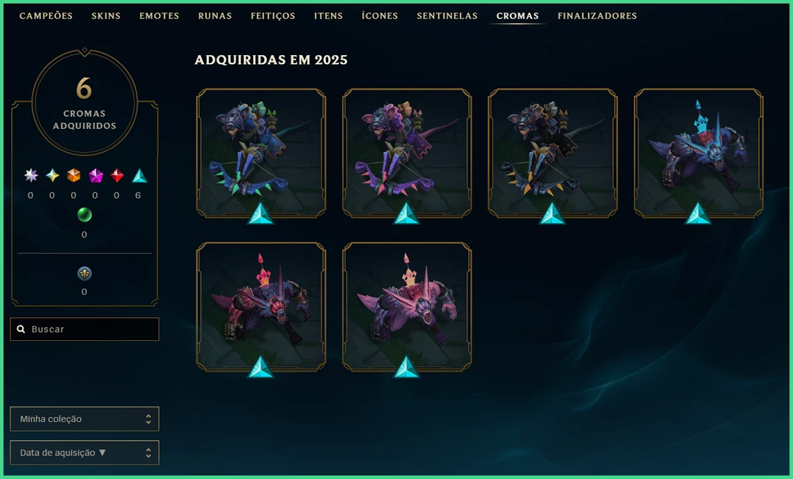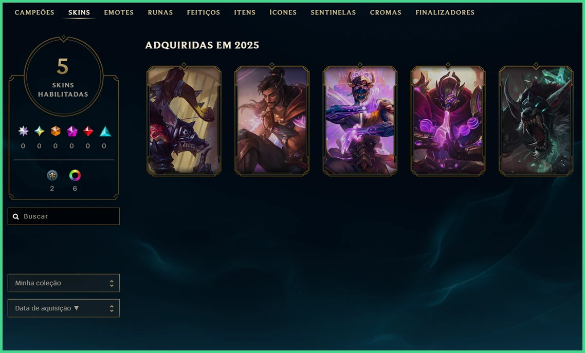 🎭5 Skins: Akshan Três Honras, Malzahar Três Honras, Shen Três Honras, Twitch Medieval, Warwick Cinzento