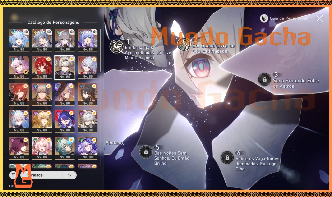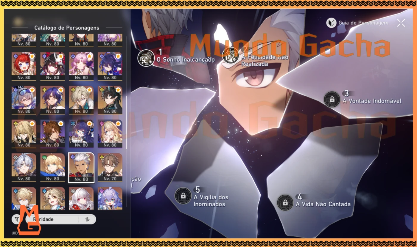 ►Personagem 5✯: E2 VAGA-LUME + E2 ACHERON + E2 HUOHUO + E2 ARCHER + E1 PHAINON + E1 ARGENTI + E1 RUAN MEI + E1 LUOCHA + NOITE ETERNA + CASTORICE + CERYDRA + ANAXA + A HERTA + TRIBBIE + FEIXIAO + HYACINE + KAFKA + CISNE NEGRO + SPARKLE + AVENTURINE + SUNDAY + JING YUAN + AGLAEA + TOPAZ + JINGLIU + BLADE + DAN HENG EL + LOBA PRATEADA + FU XUAN + SEELE + ROBIN + SABER + DR. RATIO + E6 BRONYA + E3 HIMEKO + E2 WELT + E2 YANQING + E1 GEPARD + CLARA + BAILU