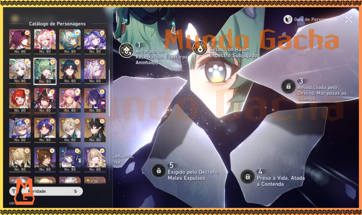 ►Personagem 5✯: CASTORICE + ACHERONe1 + VAGA-LUMEe1 + RUAN MEIe1 + JINGLIUe1 + LINGSHA + FUGUE + A HERTA + KAFKA + CISNE NEGRO + SPARKLE + FU XUAN + SEELE + DR. RATIO + BRONYAe4 + BAILUe3 + WELTe2 + HIMEKOe1 + GEPARDe1 + YANQINGe1 + CLARA