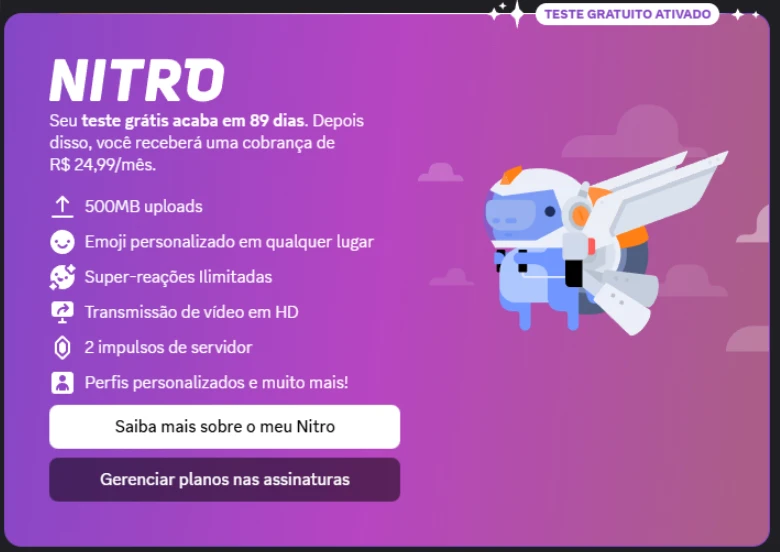 Este produto é um Nitro Trial (período promocional). Ao final do prazo, o benefício expira conforme as regras do Discord.