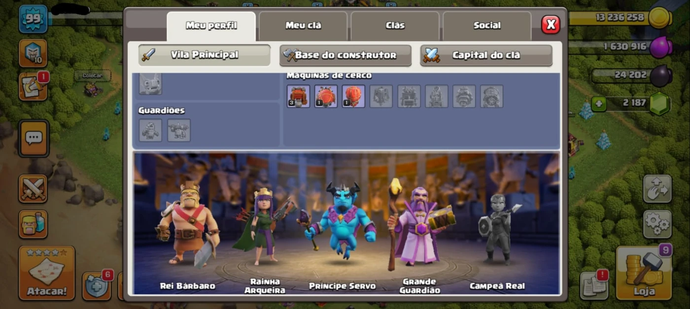 Conta CV12 bem upada 2200 gemas Rei 41 Rainha 42 Servo 36 Guardião 24 A conta possui diversas poções para uso. necessário gemas para alteração de nome. níveis das tropas na foto. Conta com dono único, é possível alterar todos os dados da conta e ela será completamente sua!