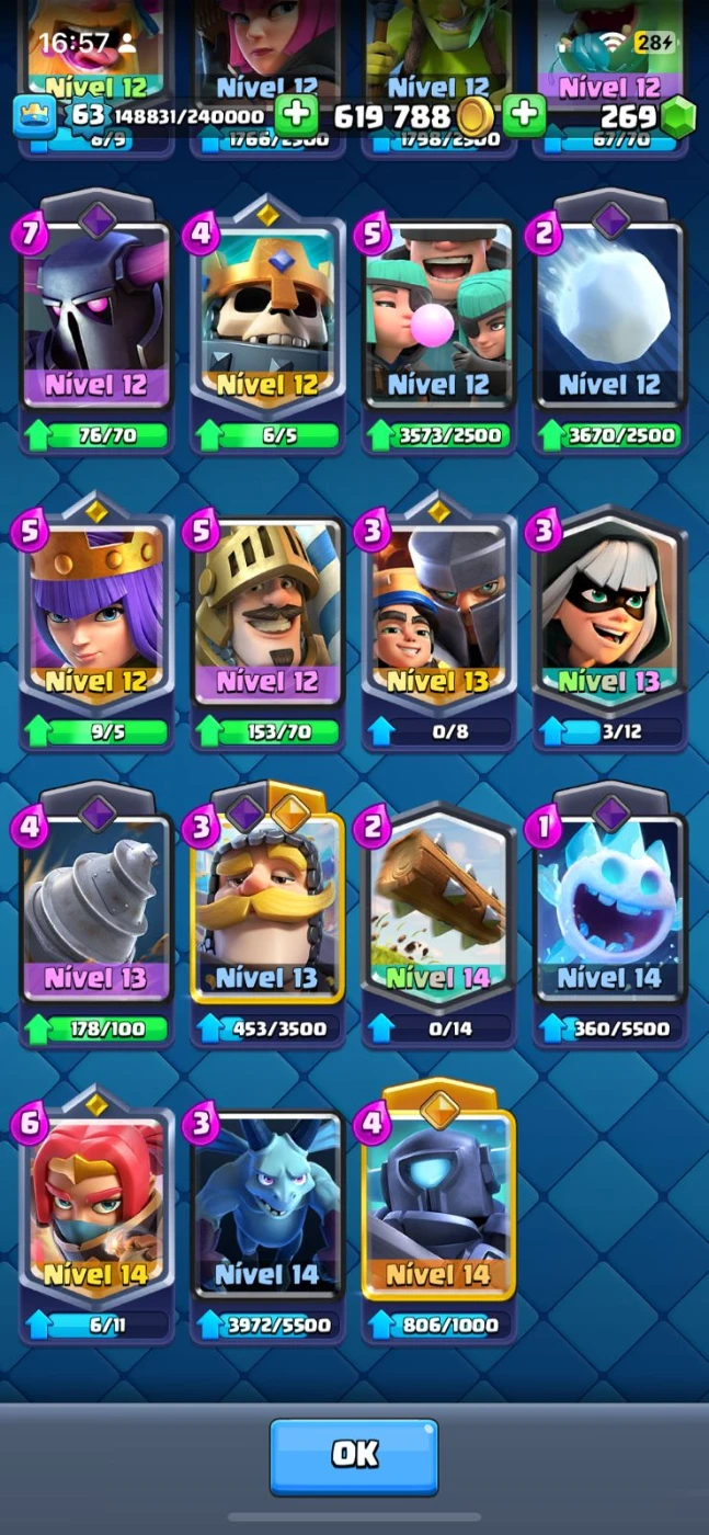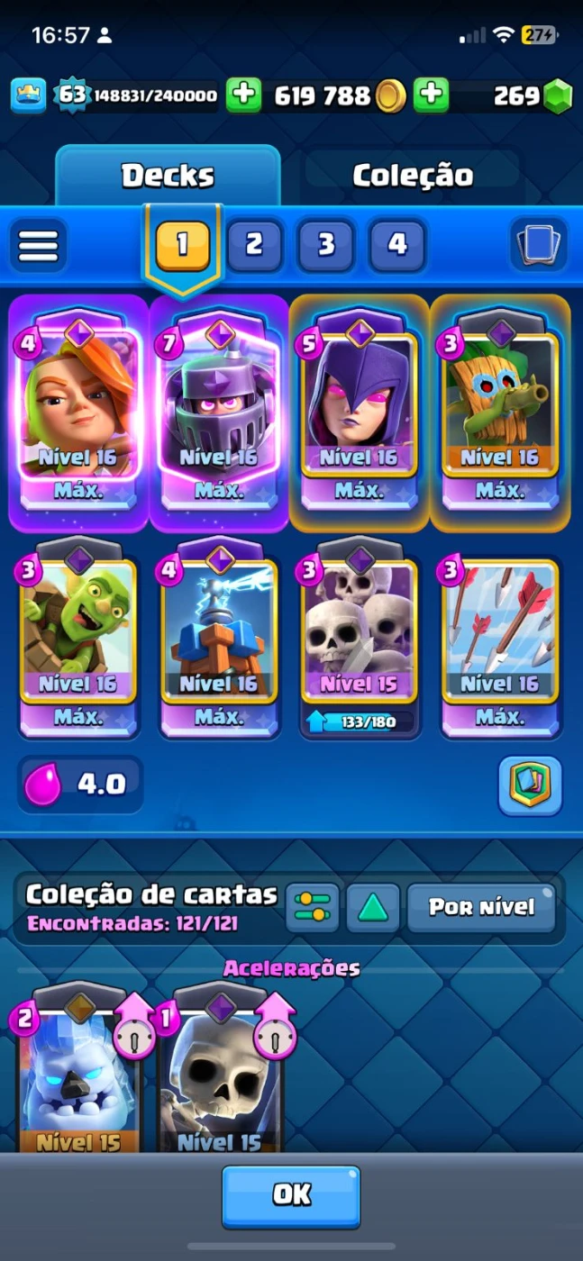 7 carta level maximo (16)> valquiria, megacaleiro, bruxa, goblin com dardo, flechas, tesla, barril de goblins,