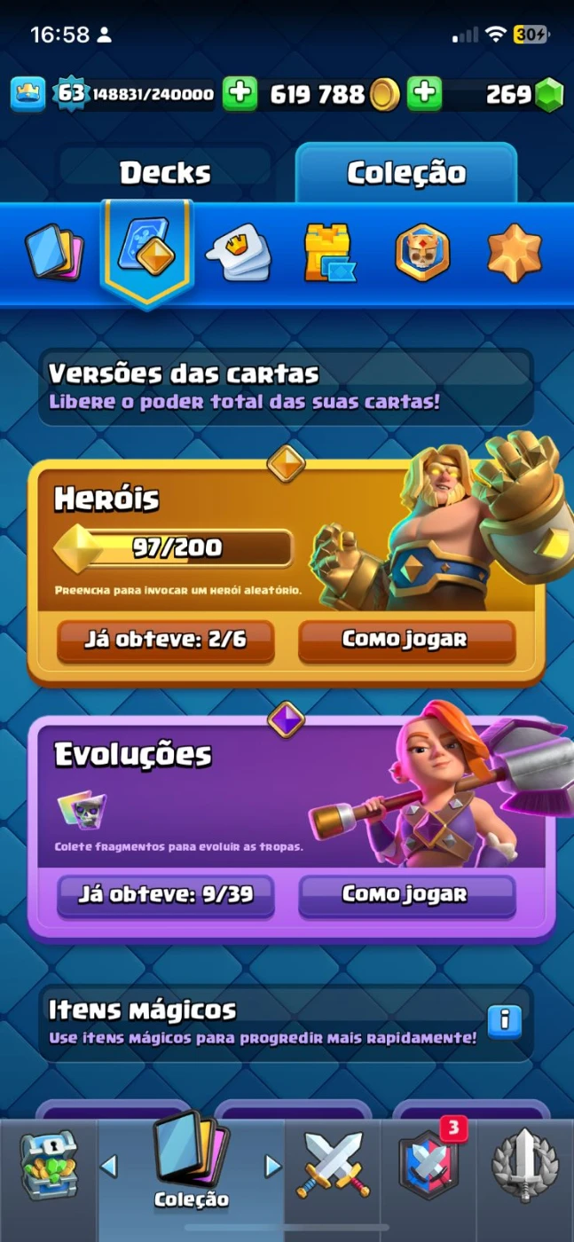 9 evos: megacavaleiro, valquiria, barbaros, lenhador, tesla, bruxa, porcos, morteiro, caçador, e fornalha