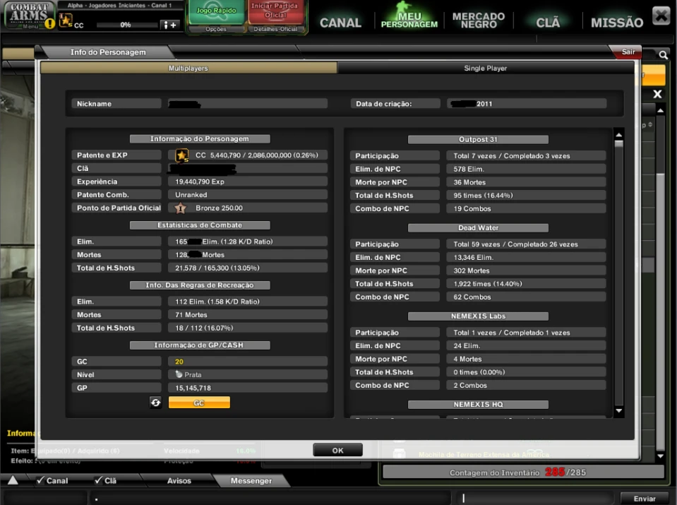 Conta criada em 2011, possui um inventário completo de 280/280, ela conta com kits completos do 1º, 2º, 3º, 4º e 6º aniversário, além de de outros itens que podem ser vistos nas imagens, incluindo alguns itens nos pertences de 2012, 2013, 2014 e 2015 que ainda podem ser ativados. Lider de clã lvl 5.