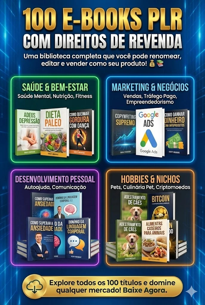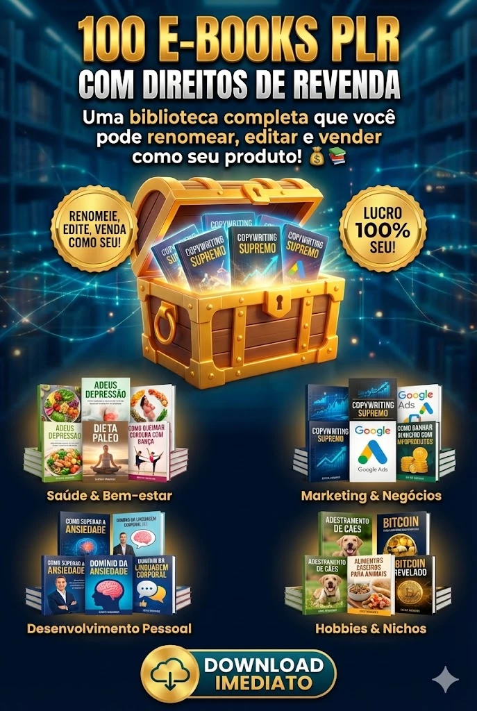 Apresentamos o Pack Ultimate PLR: Uma coleção massiva com 100 E-books prontos nos nichos mais lucrativos do mundo. Não são apenas textos genéricos; são produtos completos que você pode assumir a autoria hoje mesmo.