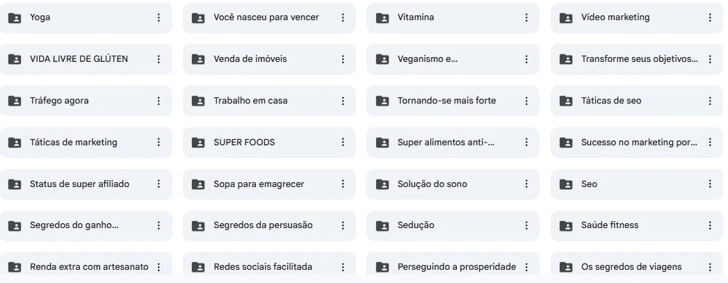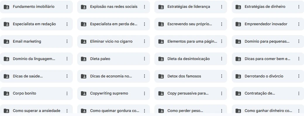 "Copywriting Supremo", "Google Ads", "Bitcoin Revelado", "Como Ganhar Dinheiro com Infoprodutos" e "Marketing Viral".