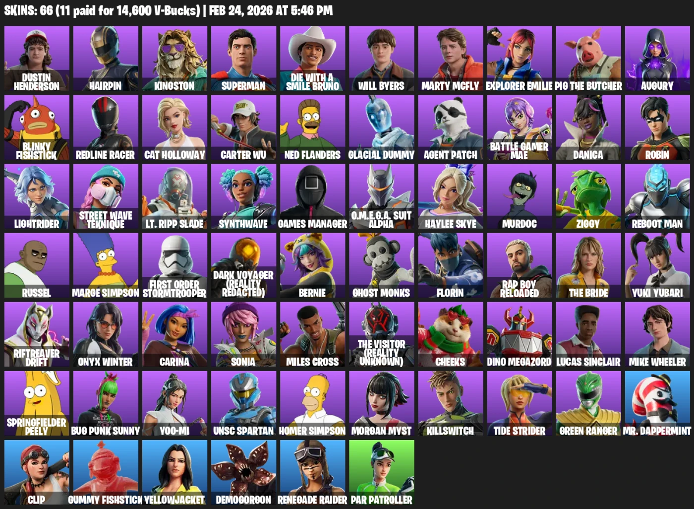 66 Skins top (11 pagas com 14.600 V-Bucks): Dark Voyager Season 3 (raro Battle Pass antigo – aquele visual clássico espacial que não volta mais no shop!), Stranger Things completo (Dustin, Eleven/Hairpin, Mike, Will, Lucas, Demogorgon + mais), Simpsons icônicos (Homer, Marge, Ned), Green Ranger + Dino Megazord (Power Rangers), UNSC Spartan (Halo), Robin (Batman), O.M.E.G.A. Suit, Glacial Dummy e dezenas de outras premium!