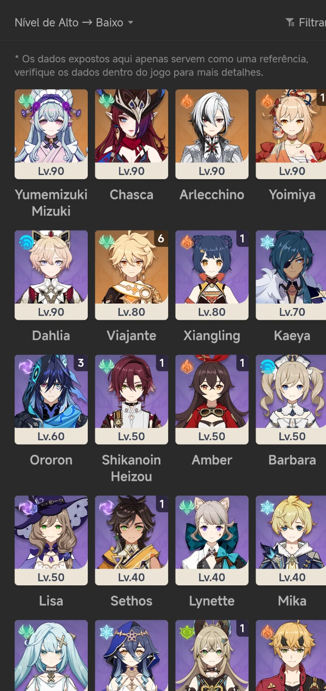 Conta de Genshin com: Yoimiya C1, Chasca e Arlequinno com build +ou- boa da pra melhorar ainda mais a build delas uma das armas T5 é a assinatura da Mualani