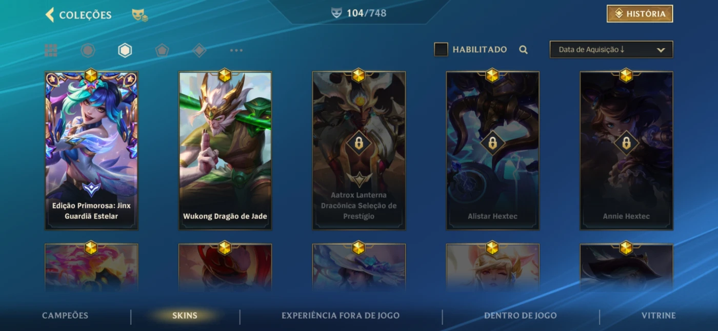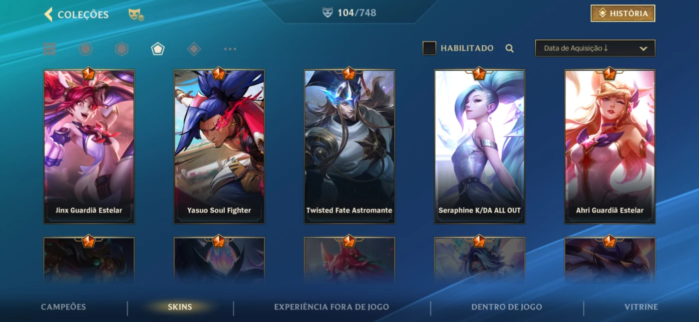 • 104 skins diversas, incluindo 2 prestígio e 5 lendárias (780R$ em skins com muita variedade e surpresas)