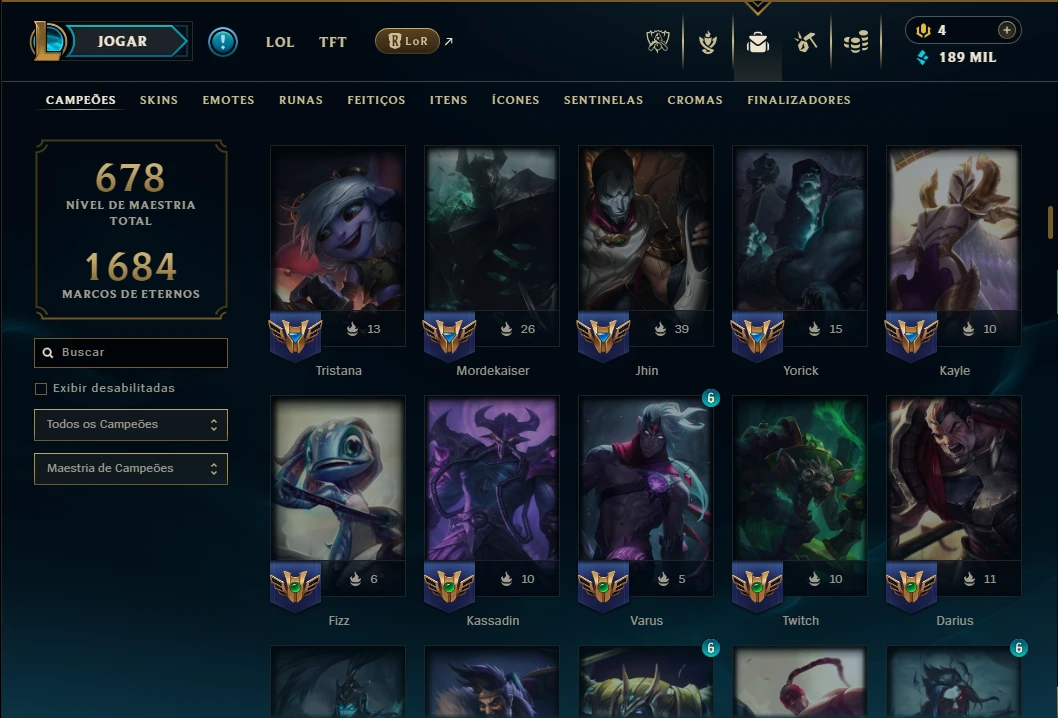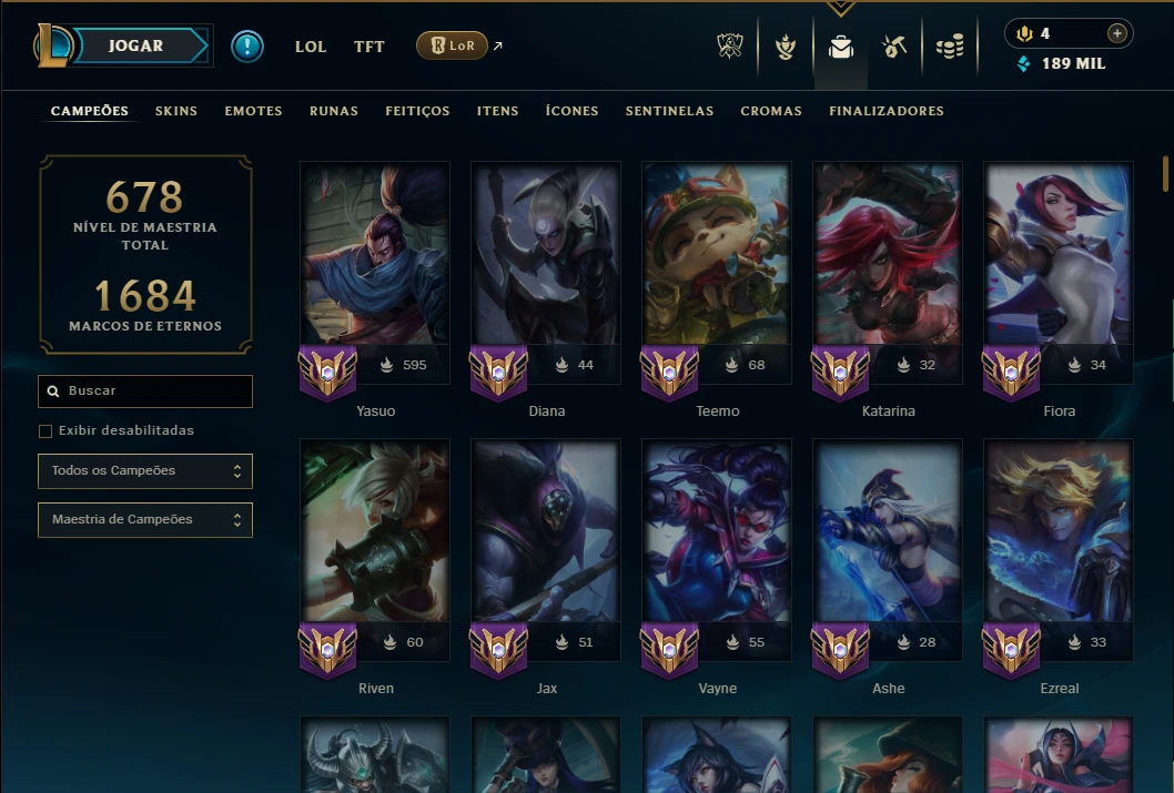 ( MID / TOP / ADC ) - ( Nivel 492 ) - Conta Prata 2 com mais de 700 Jogos, Maestria 73 de Yasuo, 15 de Diana, 13 de Katarina, 12 de Riven, 25 Maestrias acima de 7, 190 Skins, 3 Vitoriosas, 189k de EA, 24 Cromas, 287 Ícones, 176 Emotes, 1 Fragmento de skin, 15 Essencias Miticas, 3 Reembolsos e Honra 4.