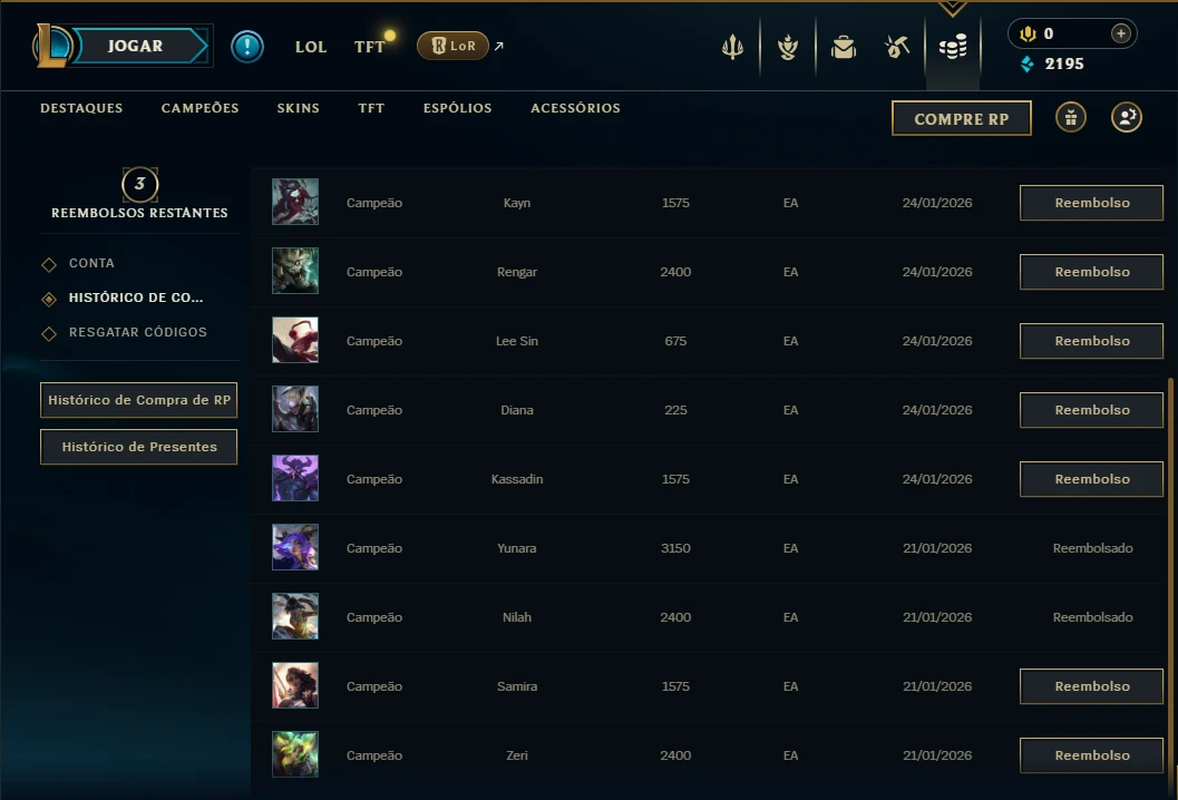 Conta Unranked com 40 Champs e 6 Skins, 3 Reembolsos e Honra 3.