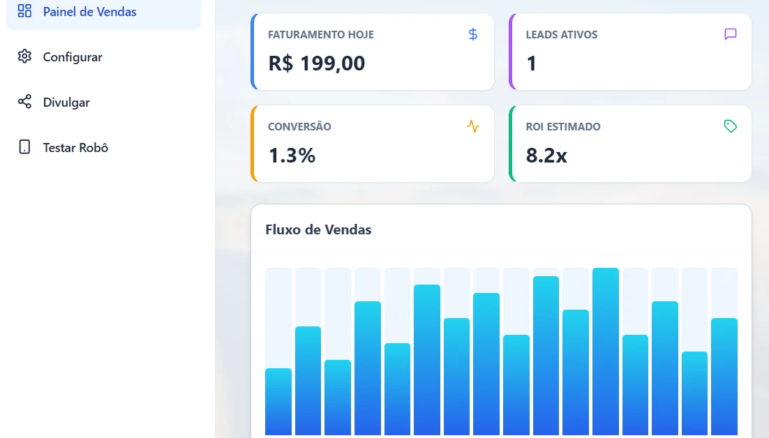 Venda como Serviço (SaaS): Hospede o painel e cobre R$ 49,90 a R$ 97,00 mensais de pizzarias, hamburguerias e lojas de roupa para elas usarem o robô.