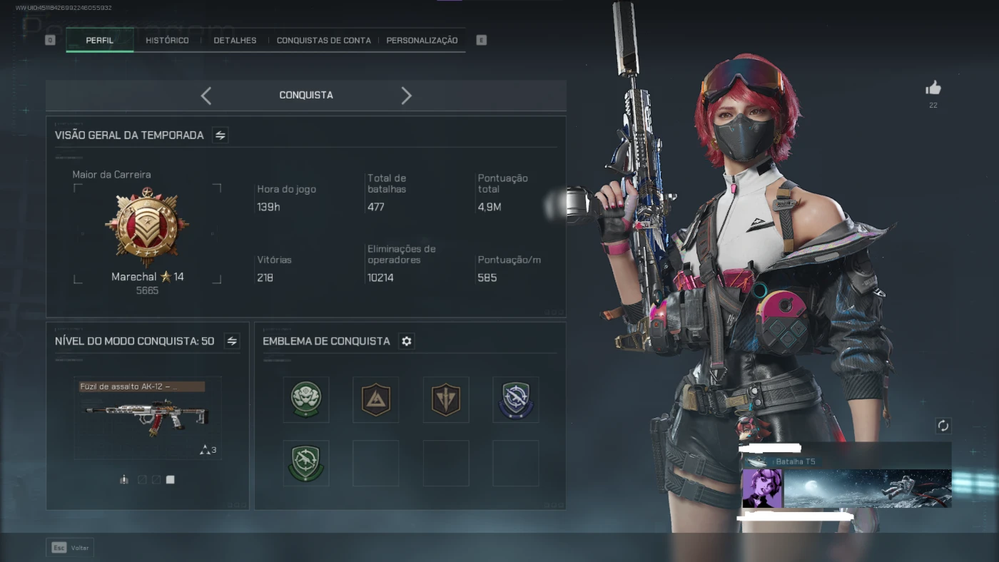 Estatísticas: 139h de jogo, 477 Batalhas, 218 Vitórias e mais de 10.214 Eliminações de Operadores!