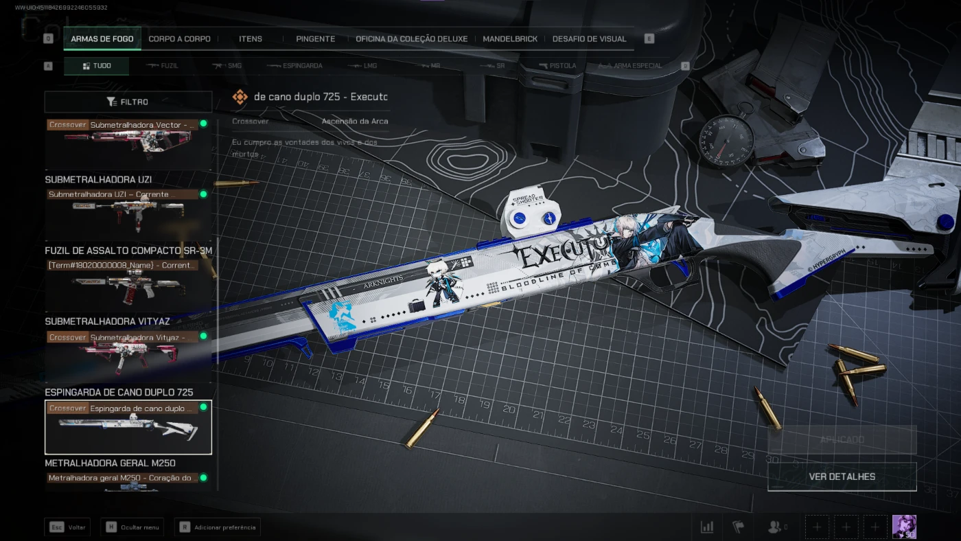 ESPINGARDA DE CANO DUPLO 725 Crossover Arknights - Exécuitor: O poder do Execúitor concentrado nesta shotgun de cano duplo. Estilo clean em branco, preto e azul.