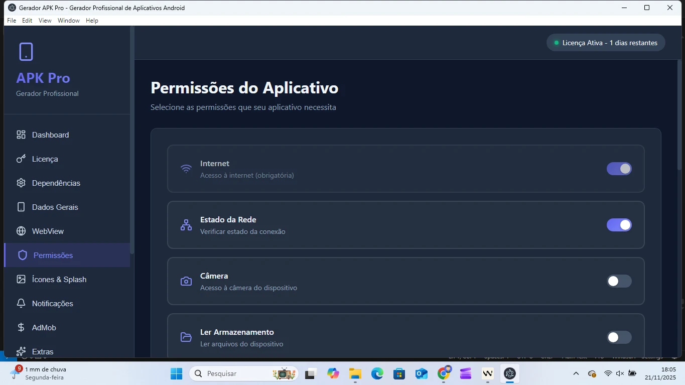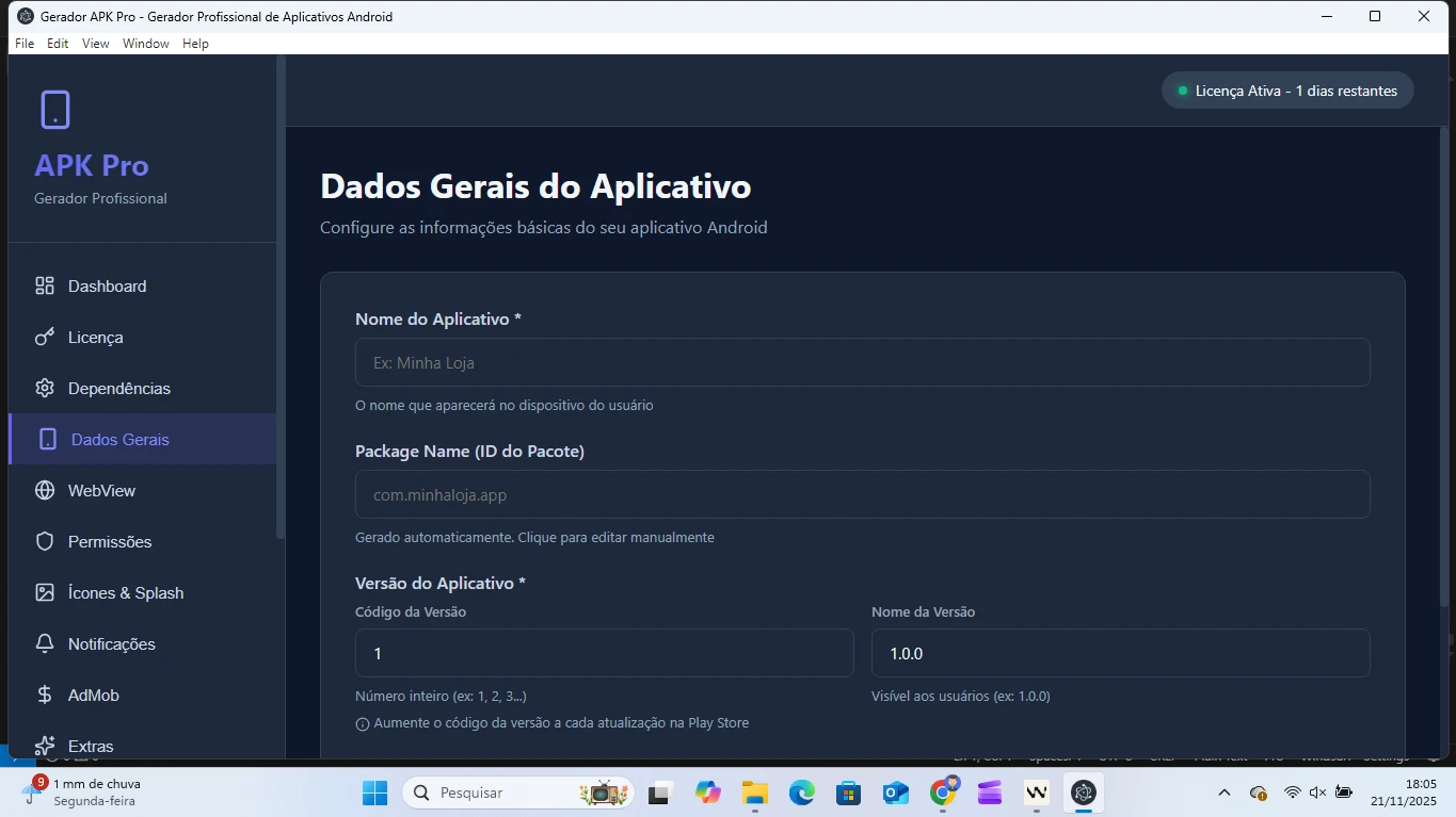 Software desktop profissional que converte qualquer site em um aplicativo Android nativo, gerando arquivos APK e AAB prontos para publicação na Google Play Store. Não exige experiência em programação e permite gerar apps completos em minutos.