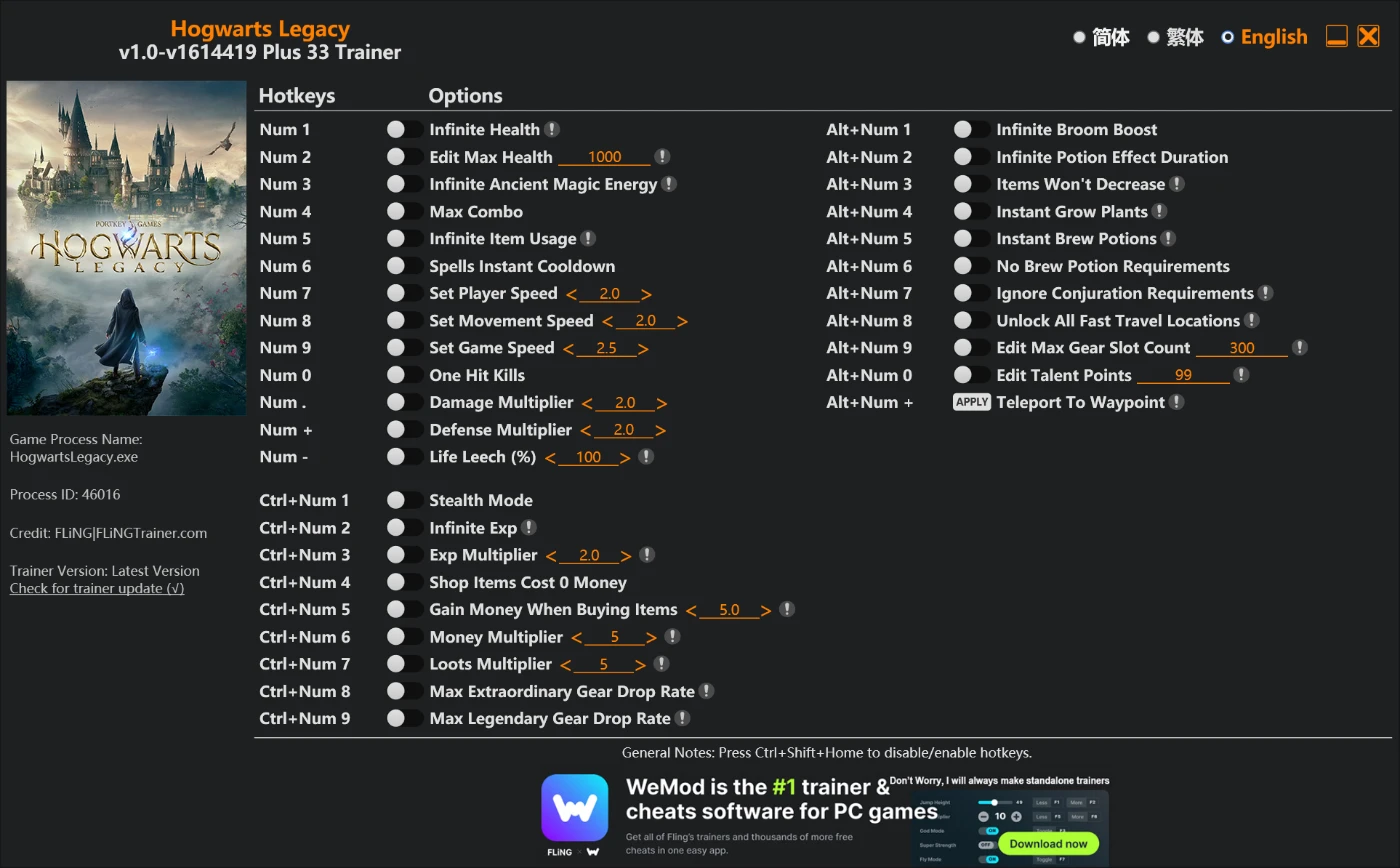 Mod Menu (Trainer menu) para HOGWARTS LEGACY