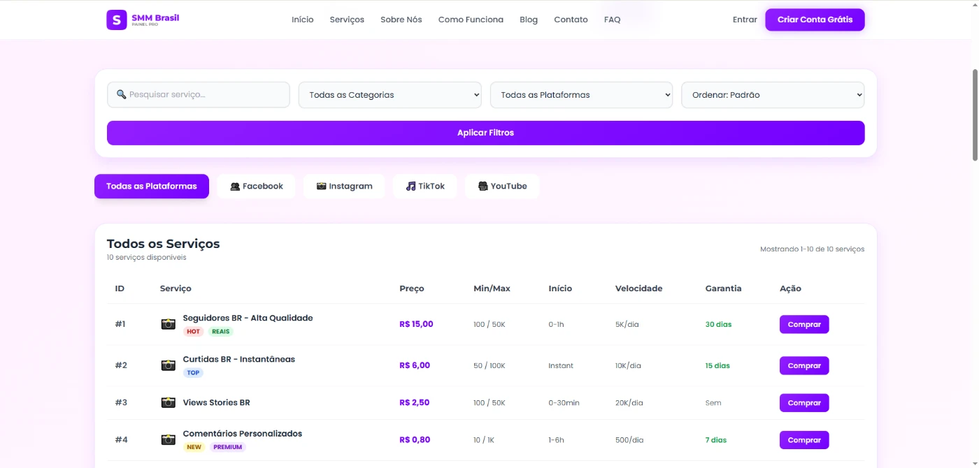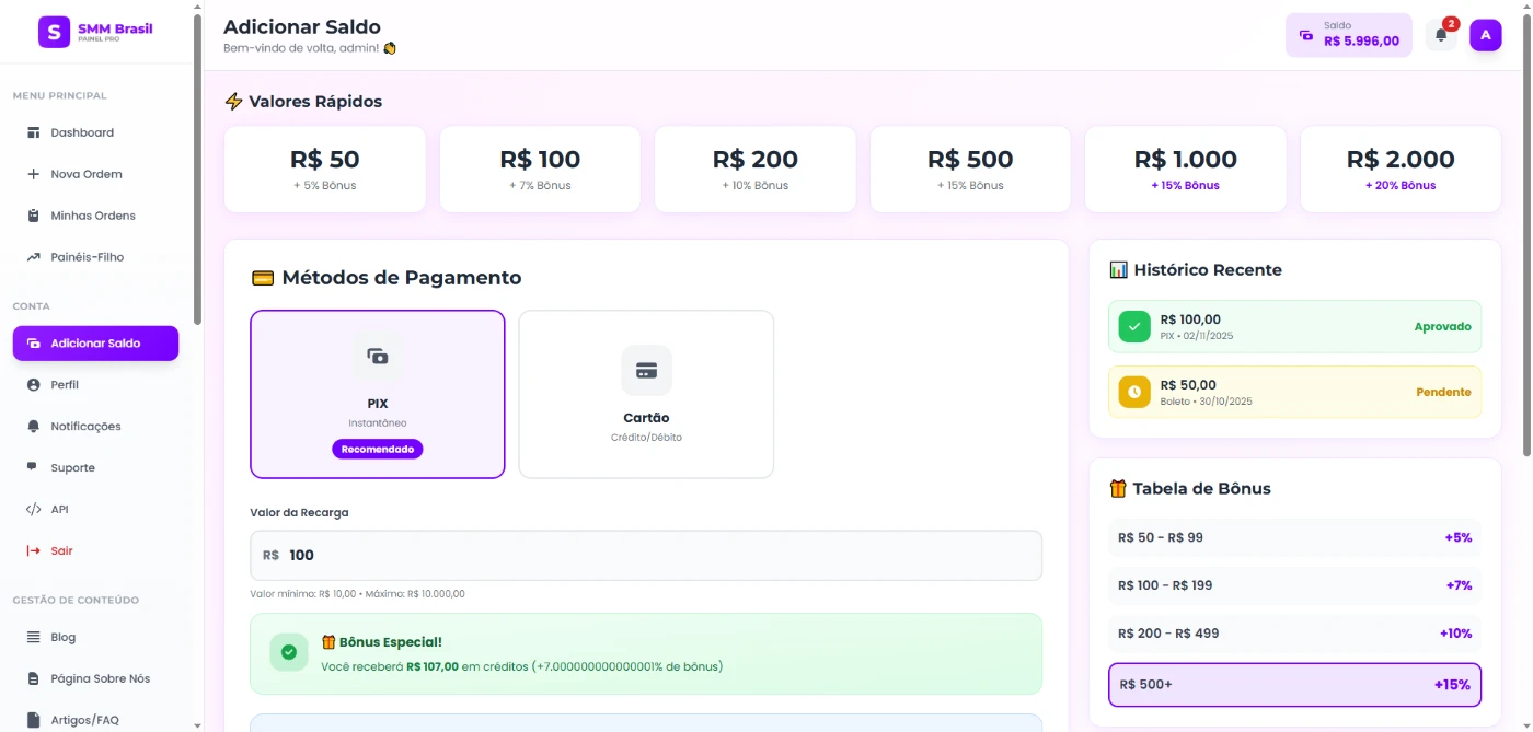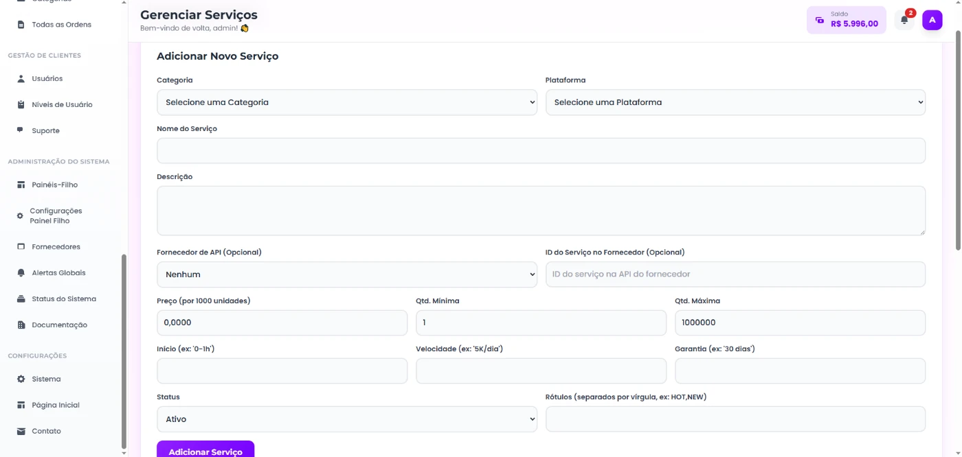 • 🔗 Integração com Fornecedores (API): Conecte-se facilmente com qualquer fornecedor de serviços via API para automatizar suas entregas.