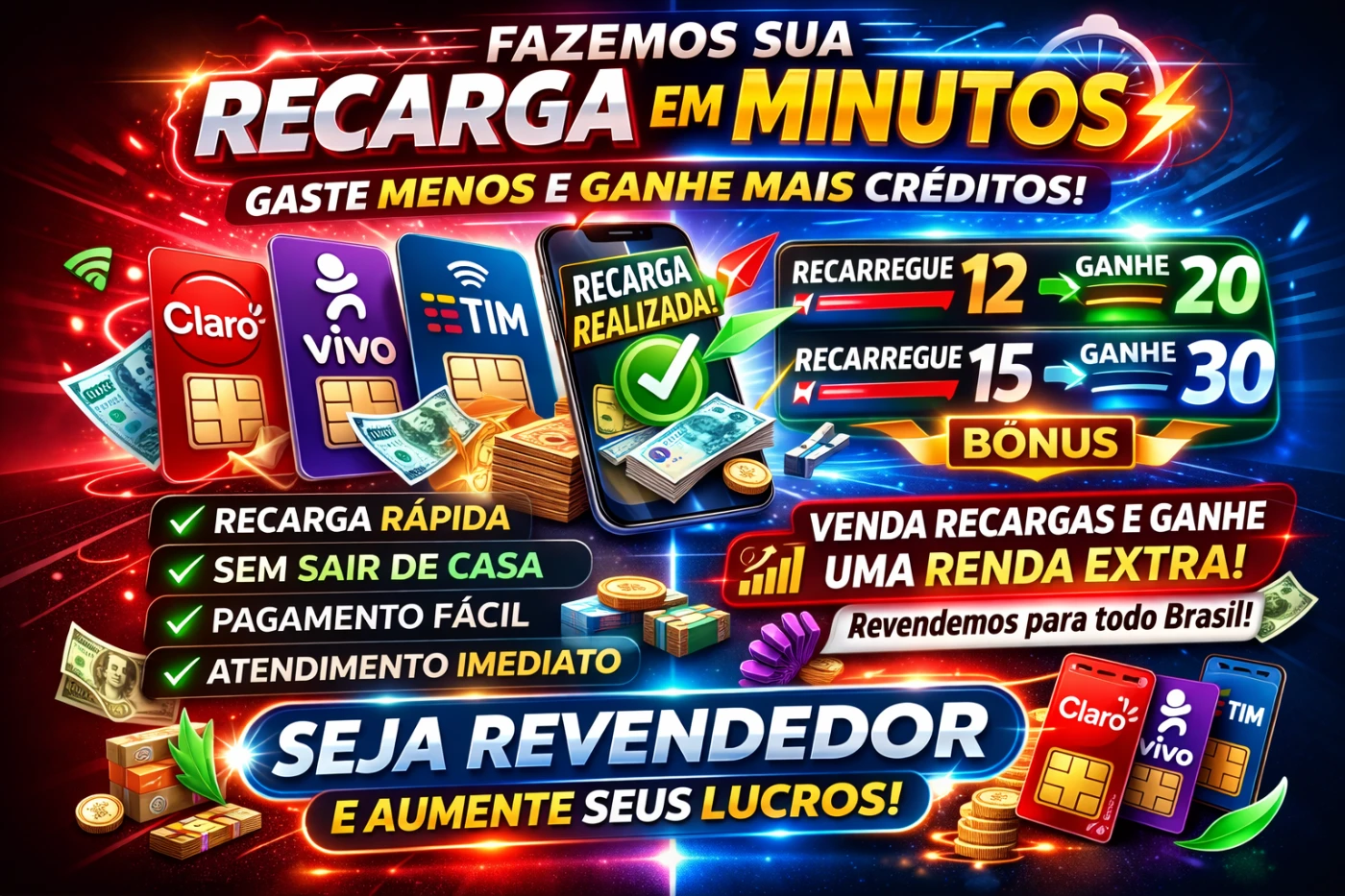 Ganhe lucro em cada recarga realizada e aumente sua renda com um sistema simples e funcional.