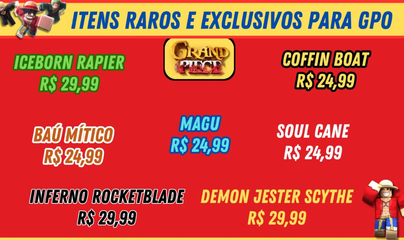 Ative suas aventuras em Grand Piece Online com itens raros que são verdadeiras joias! Cada item não é só uma adição ao seu inventário; é uma verdadeira vantagem que pode mudar o rumo das suas batalhas. Compre agora e desfrute da qualidade e eficácia de itens difíceis de serem adquiridos. Estou disponível todos os dias da semana para facilitar sua compra