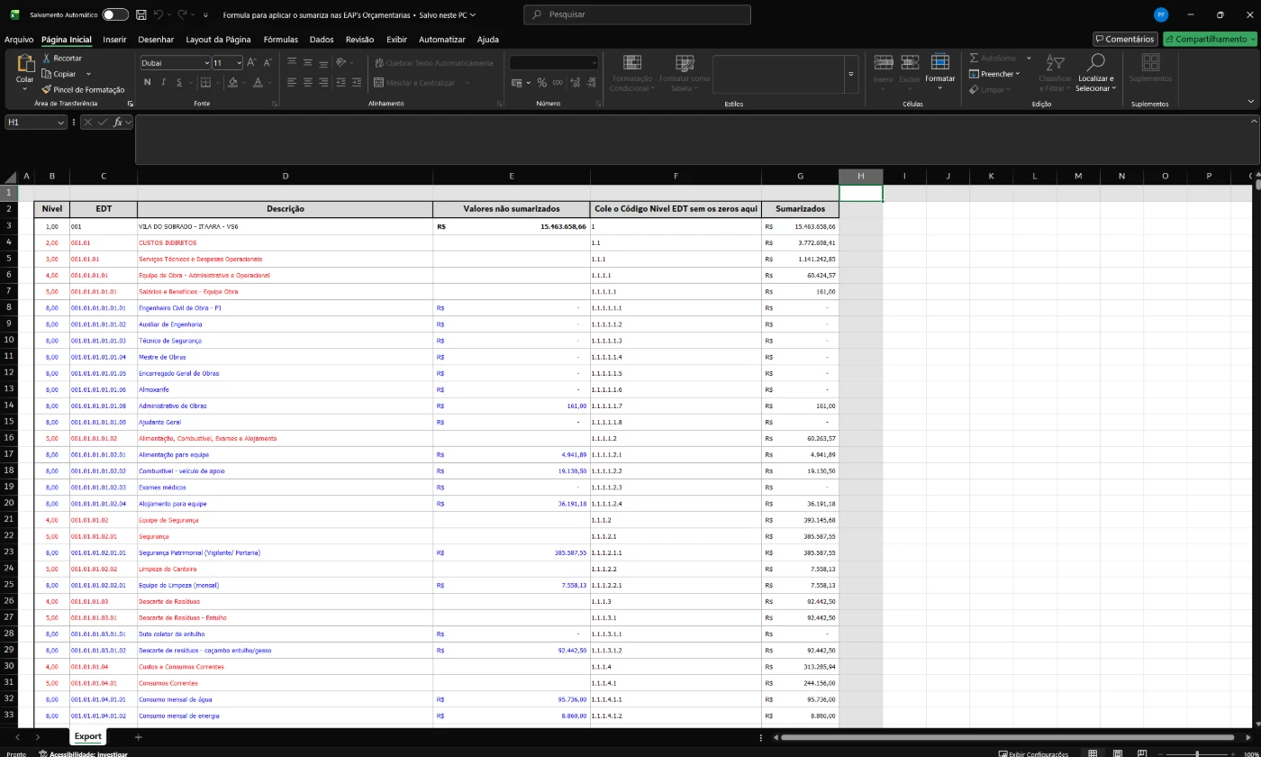A ferramenta realiza a identificação automática dos níveis da EAP e faz a sumarização dos valores nos níveis pai de forma automática, eliminando a necessidade de cálculos manuais e reduzindo erros de consolidação.